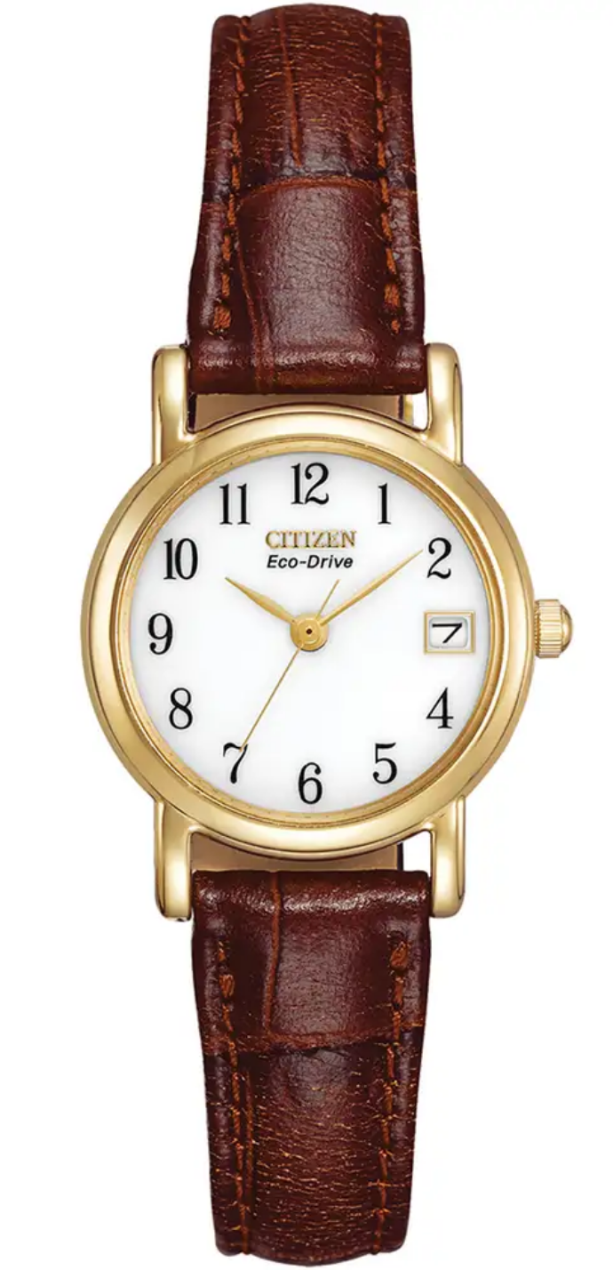 Simplicity at its finest this Citizen Eco-Drive watch is styled in gold-tone stainless steel, a white dial with black accents and a brown leather strap. Featuring Eco-Drive technology – powered by light, any light. Never needs a battery.